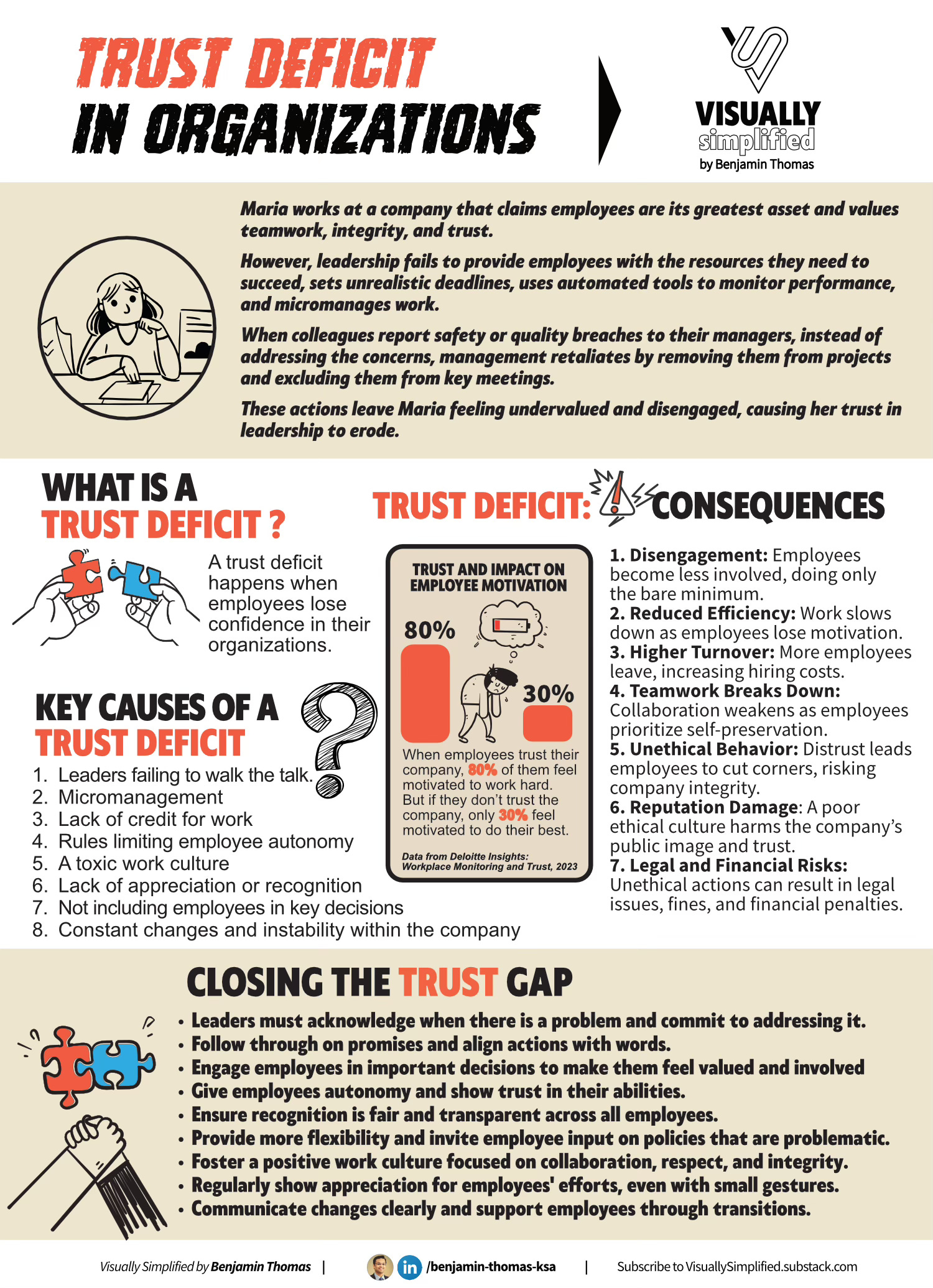 To better understand how trust deficits develop and what steps leaders can take to restore trust, check out the infographic below, which breaks down the key causes, consequences, and solutions for closing the trust gap in organizations.